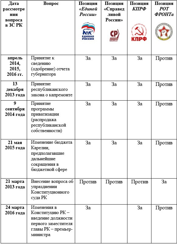 Все эти факты легко проверить, ведь итоги поименного голосования размещаются на сайте Законодательного Собрания Карелии. Заметим, что все это происходило с молчаливого согласия нынешнего руководства КПРФ. Депутаты от КПРФ, поддерживающие политику «Единой России» и на этих выборах включены в состав партийного списка.