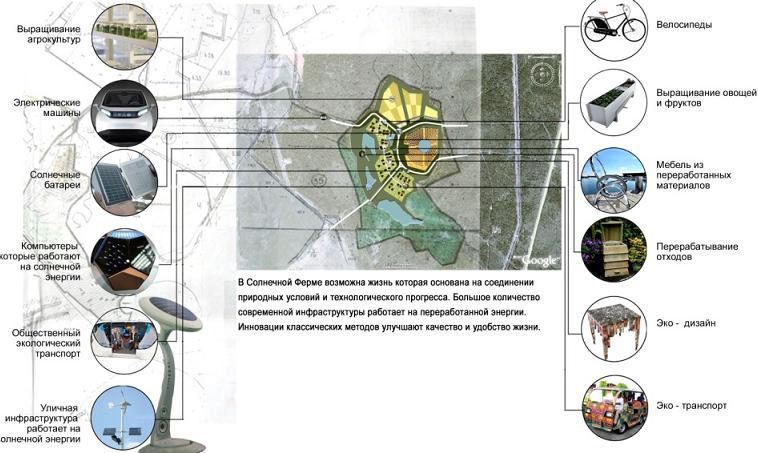 Сам проект - часть программы создания сети автономных поселений, что предусматривает появление в РФ сети таких полисов, причем в разных природно-климатических зонах. Базовый вариант «Солнечной фермы» - автономный полис из 10-12 усадеб (на семью до 12 человек каждая) с замкнутым контуром жизнеобеспечения. Общая площадь фермы - до десяти гектаров, часть из которой образуется за счет рекультивации старого карьера. «СФ» становится экологически сбалансированным решением с оптимальной «совокупной стоимостью владения». Здесь - оранжереи, прудовое рыбоводство, производство хлеба (пекарня) и разведение птицы. Применяется замкнутый контур жизнеобеспечения: комплекс высокотехнологичных инженерных систем и альтернативной энергетики.