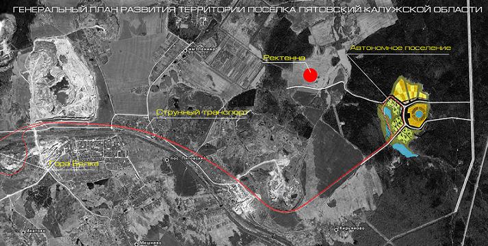 Площадкой для его воплощения станет поселок Пятовка в Калужской области, район старого песчаного карьера. Местность на сегодня совершенно обезлюдевшая. Проект должен стать антикризисной мере: годовые сборы в бюджет местного района - только 6 млн. рублей, тогда как только ремонт дорог здесь в 8 миллионов обходится. Земля под проект уже отведена.