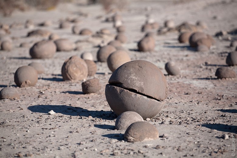 Округлая форма шаров среди каменных россыпей говорит, что они не являются продуктом «слепой» природы. Надо заметить, что крупные шары, повернутые чуть набок, имеют небольшую вытянутость - «шею», вероятно, служившую им опорой в земле.