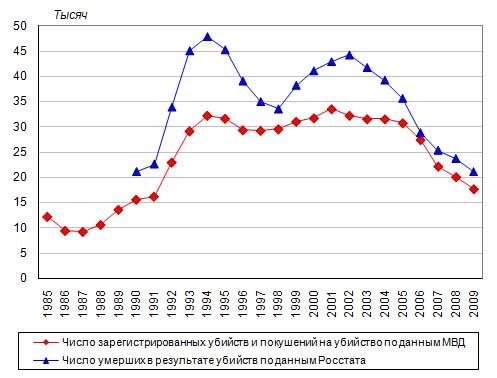 Рис. 1. Число зарегистрированных убийств и покушений на убийство и умерших в результате убийств в Российской Федерации, 1985-2009 годы, тысяч. Источник: http://demoscope.ru/weekly/2010/0413/barom02.php