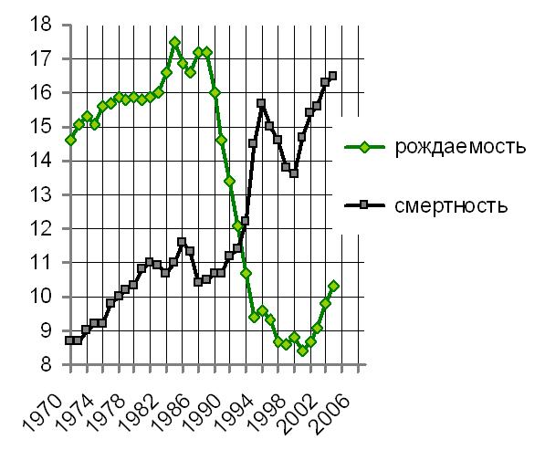 Рис. 2. Рождаемость и смертность в РСФСР и РФ (на 1 тыс. населения). Источник: http://www.kara-murza.ru/books/wb/wb002.html. Первичный источник: Росстат, 2006