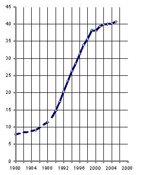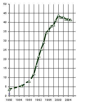 Рис. 4. Состояние здоровья новорожденных в России: родилось детей больными, в % от числа родившихся. Источник: Кара-Мурза С. Г., Батчиков С. А., Глазьев С. Ю. Куда идет Россия. Белая книга реформ. Алгоритм, 2008.