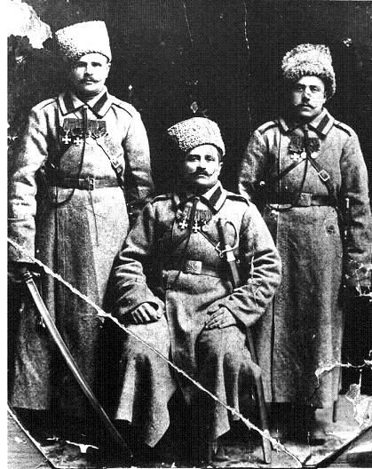 Репродукция со старой изломанной фотографии. На ней, судя по длинным шинелям, 3 кавалериста первой мировой войны, судя по всему - 3 драгуна. Унтер-офицерские лычки, на груди по два креста с бантами, медали. В центре Михаил Белокур - мой дед по матери. Этот дед умер, когда я еще не родился, а когда мне было 9 лет, погибла моя мать. Родня по материнской линии жила достаточно далеко и, главное, неудобно по транспорту. Отец вскоре привел в дом вторую мать и сводного брата Валерия, и, видимо, это тоже как-то отдалило материнских родственников. Кроме того, они довольно быстро, порой нелепо, умирали. Остались фотографии, и когда я был уже подростком, мне очень захотелось подержать в руке Георгиевский крест. Судя по фотографии, у деда по матери он был. Но... не было этого деда.