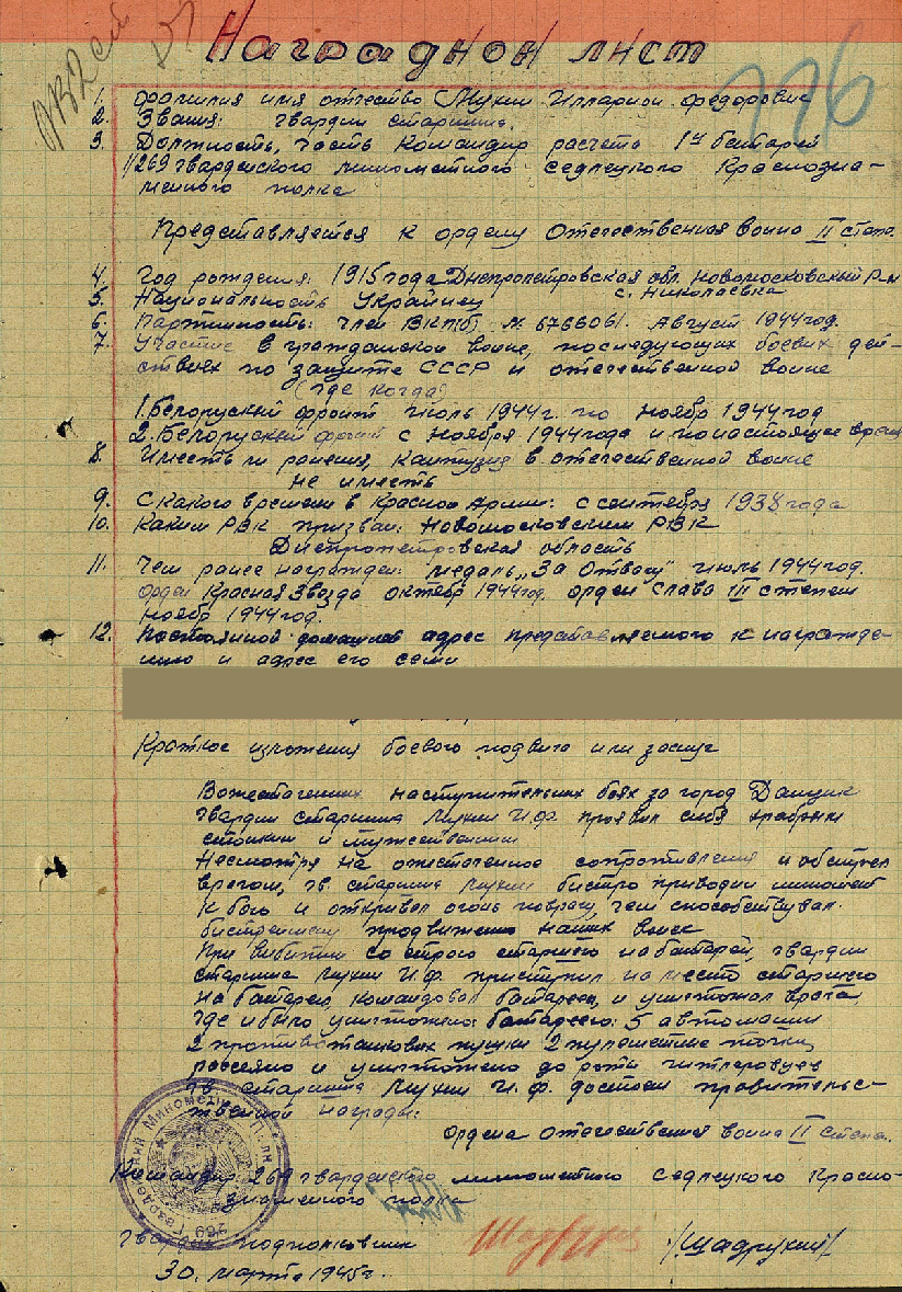 Участвовал отец и в Курской битве, и здесь, наконец, сошлись вместе все составляющие, необходимые для получения награды. Вопреки утверждению Гинденбурга, ордена оказались не в том мете, где их дают, а в том месте, где их заслуживают.
