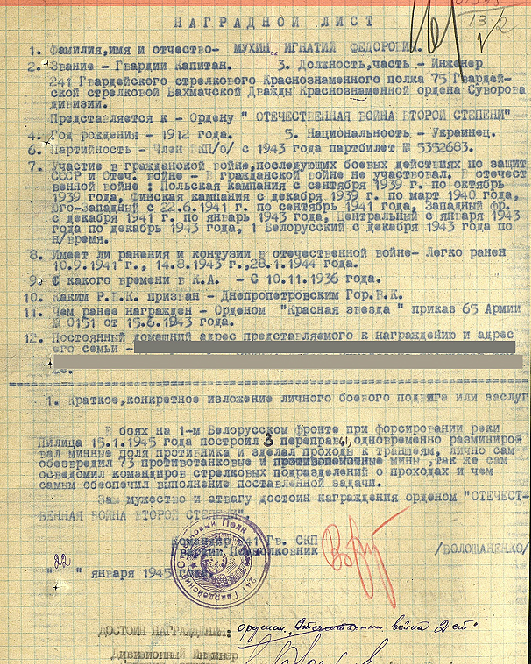 После лечения в госпитале в Армении, отец был инженером 241 гв. стрелкового полка 75 гв. стрелковой дивизии. Это я знаю. Но стыдно сказать, я даже не знаю, при каких обстоятельствах он получил осколочное ранение в лицо, еще одно ранение в ногу, и в каком бою ему прострелили навылет руку. У него было пять шрамов, с 1944 на фото появился шрам на лице под правым глазом, который был заметен всю жизнь, тем не менее, одно из этих ранений отец не считал за ранение (видимо, лечился прямо в полку) и считал, что имеет 4 ранения – два тяжелых и два легких.