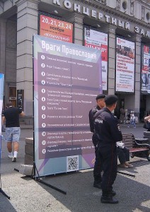 Но, конечно, центральное место этой православной экспозиции занимал специальный расстрельный списочек "Врагов Православия" с большой буквы, куда попали, понятно, "Femen", "Pussy Riot", кое-какие журналисты, публицисты и целые издания. А если кто из православных слабоват в чтении, рядом установили специальный художественный стенд с картинками и фотографиями врагов. Так, на всякий случай, чтобы добрые православные люди могли различить супостатов даже в плохо освещенном подъезде.