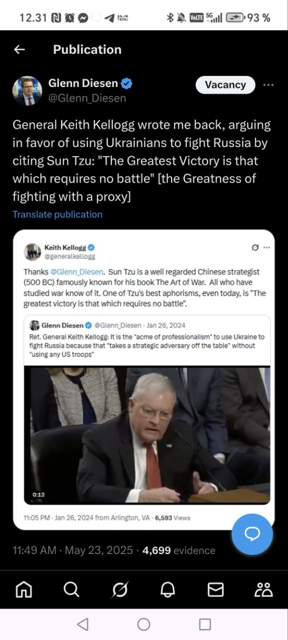 Профессор Дизен пишет, "Генерал Кит Келлогг написал мне ответ, приводя доводы в пользу использования украинцев для борьбы с Россией, ссылаясь на Сунь-Цзы: "Величайшая победа - та, что не требует сражения" [величие сражения с прокси]." Цинизм стал такой нормой, что ничего не скрывается...